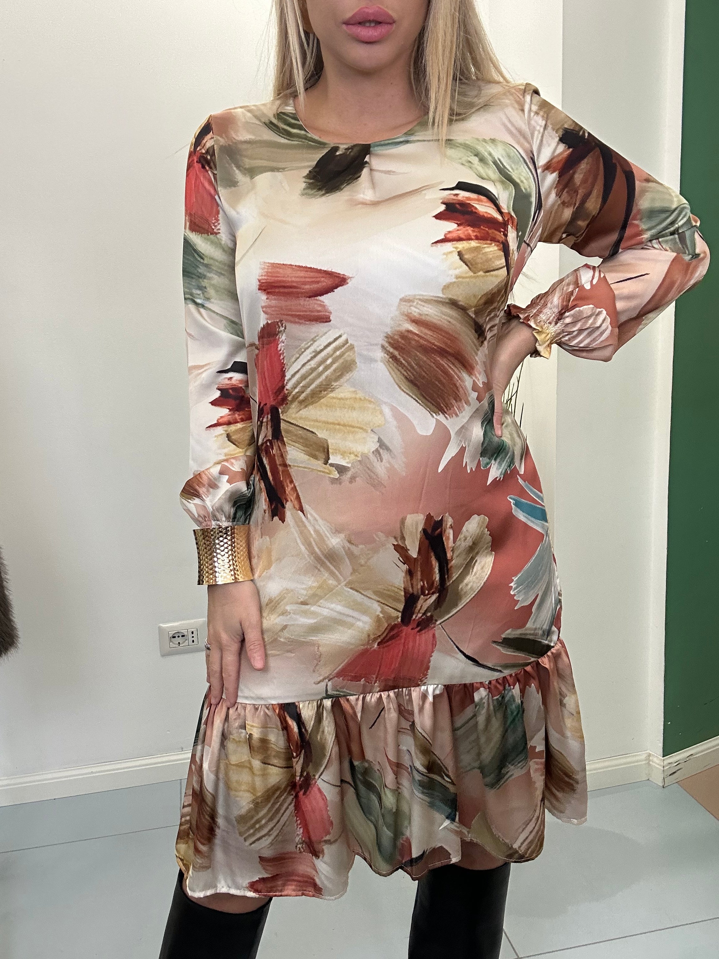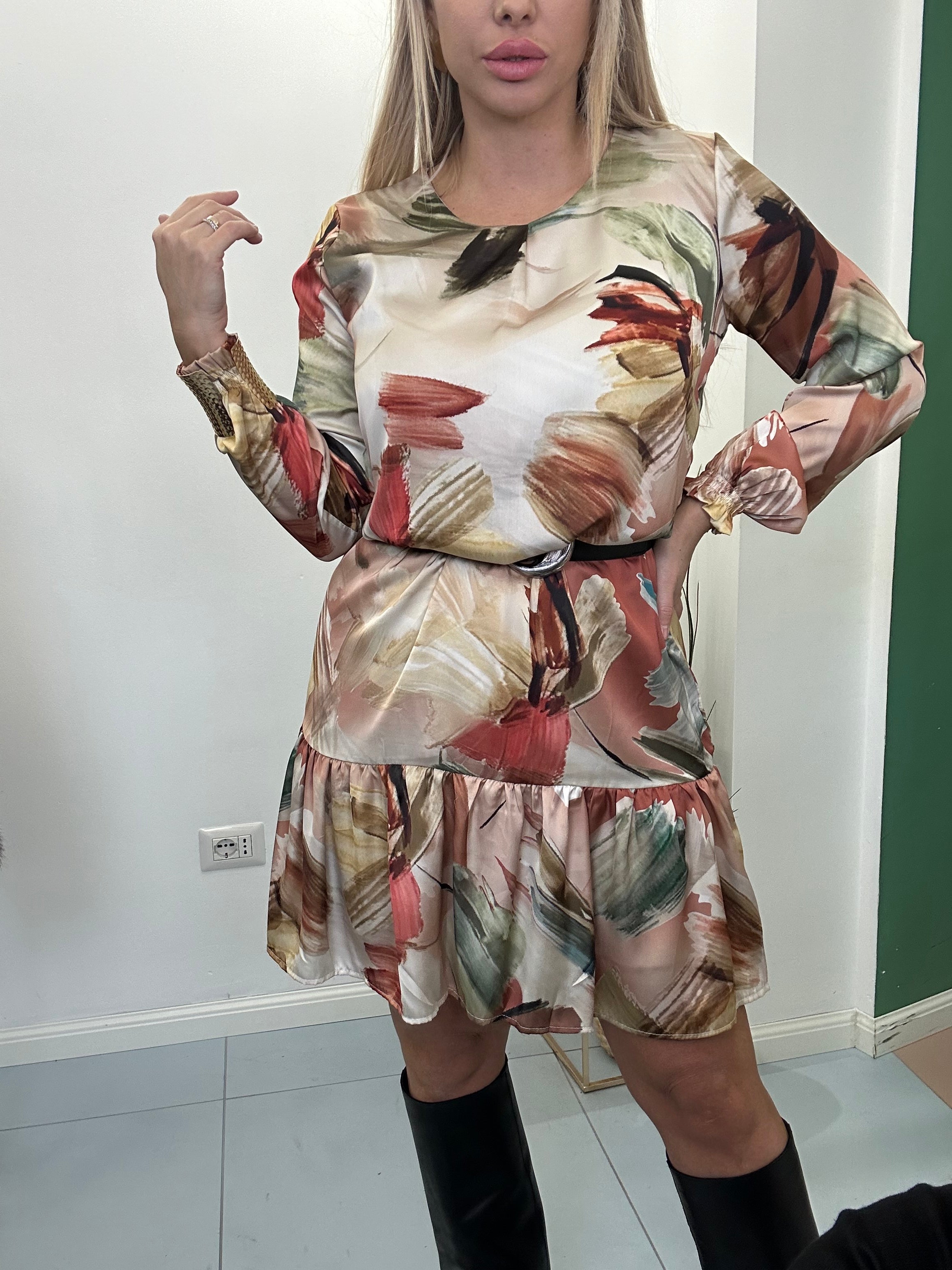 Abito fantasia con manica a sbuffo con laccio in vita