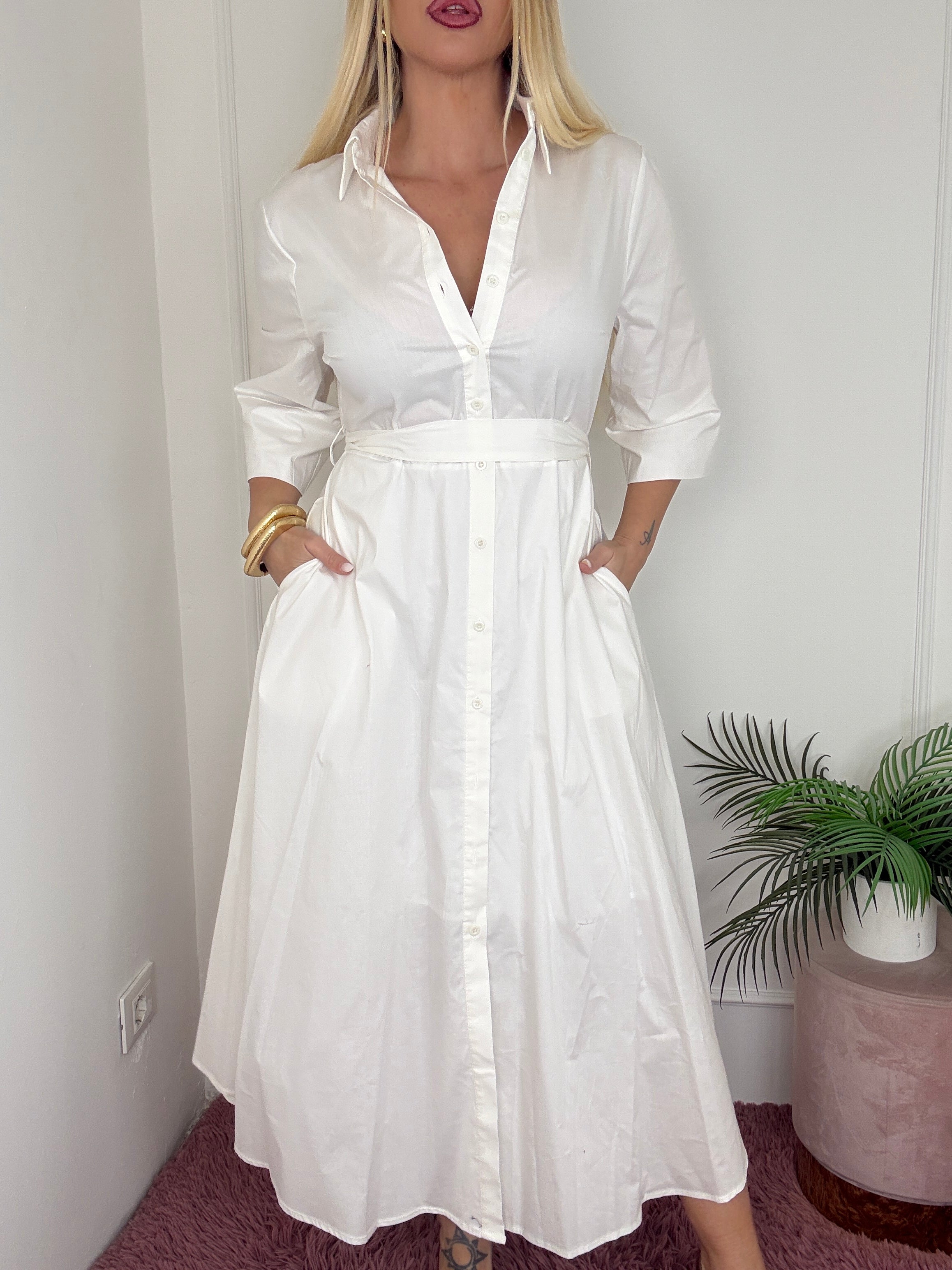 Abito lungo manica tre quarti, color bianco, con cintura,tasche e chiusura bottoni sul davanti