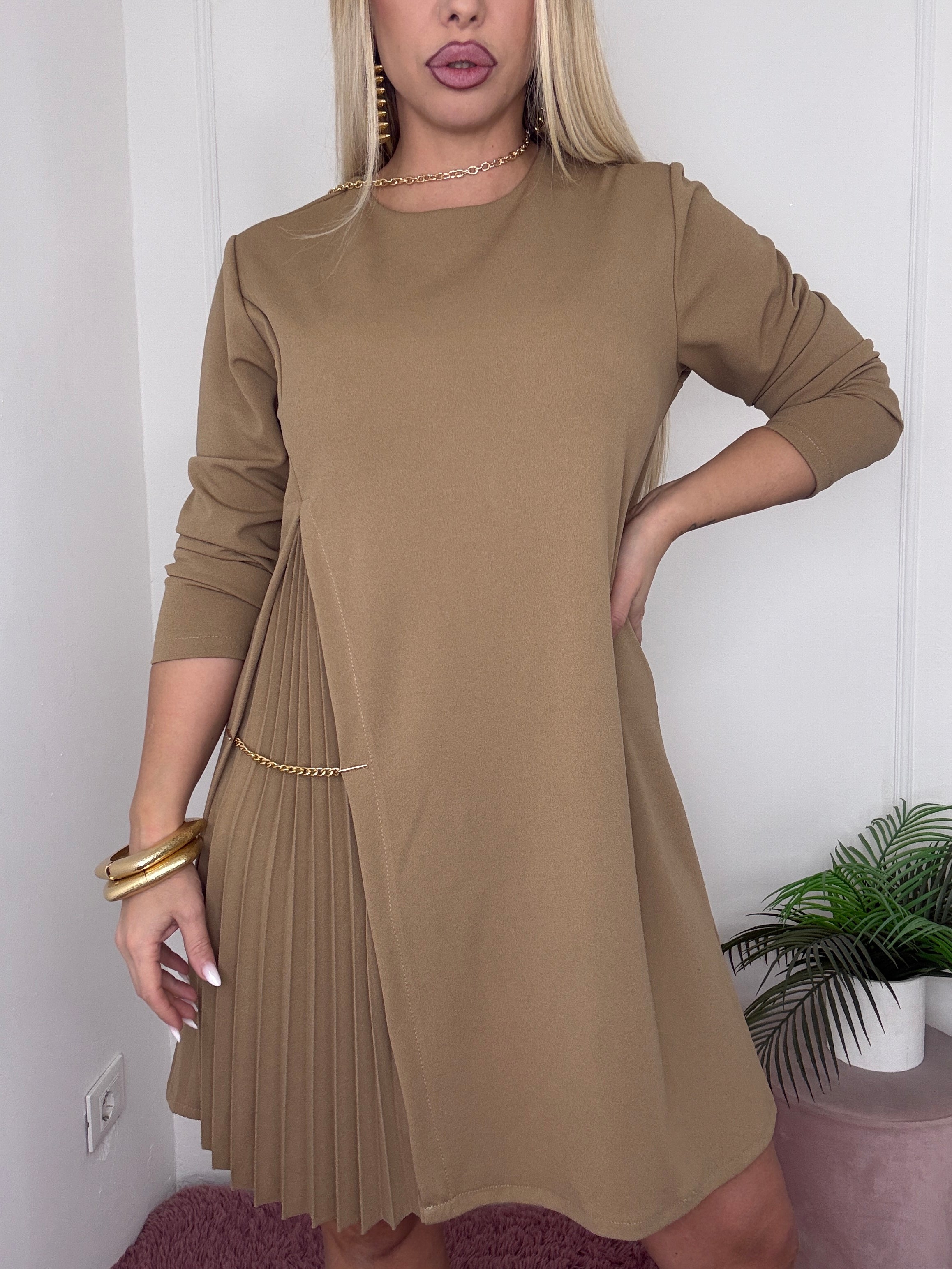 Abito a secchetto con dettaglio plissettato e catenella elasticizzato in crepe