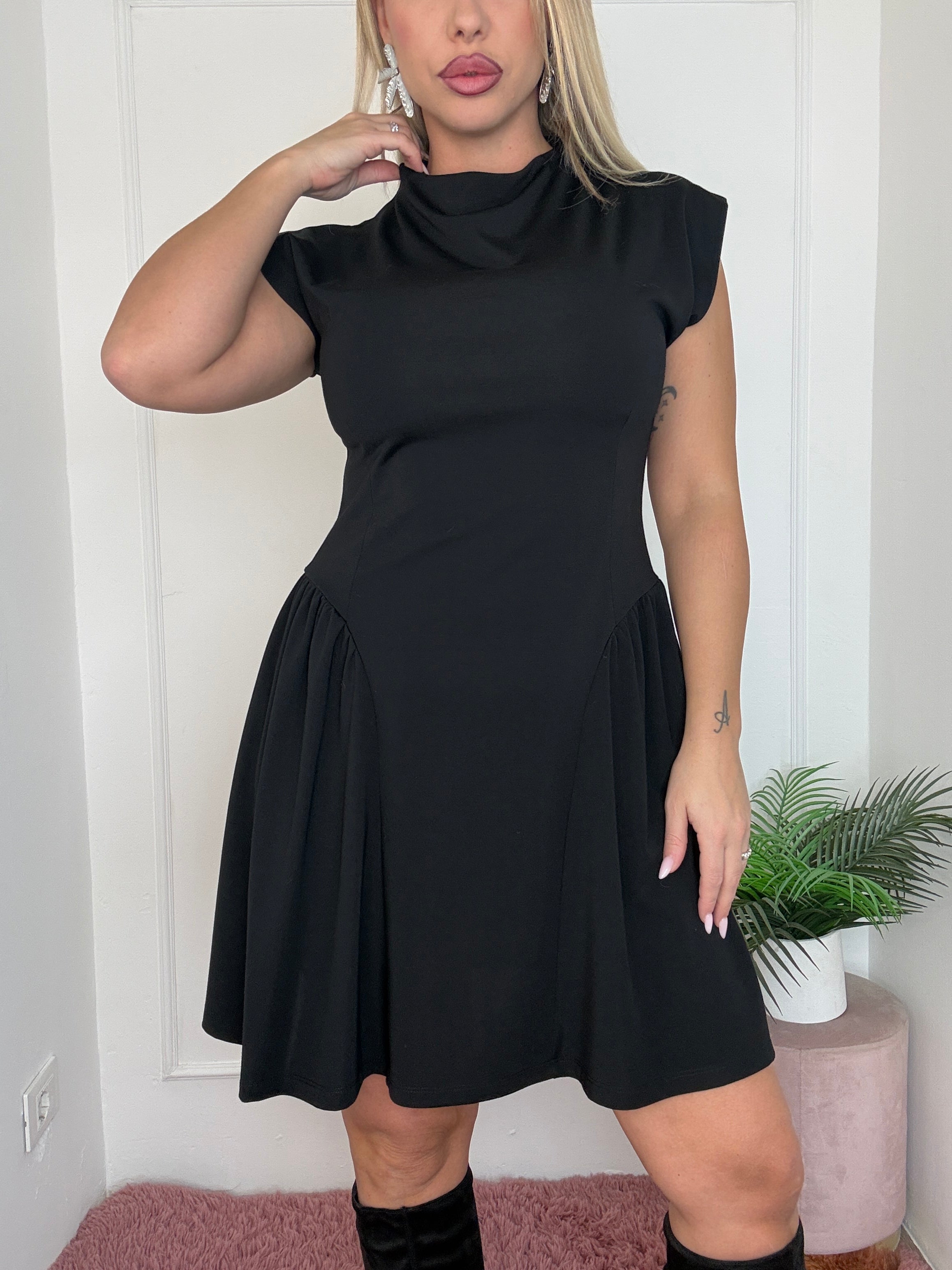 Abito corto nero, collo alla coreana manica corta larga con balze sulla gonna