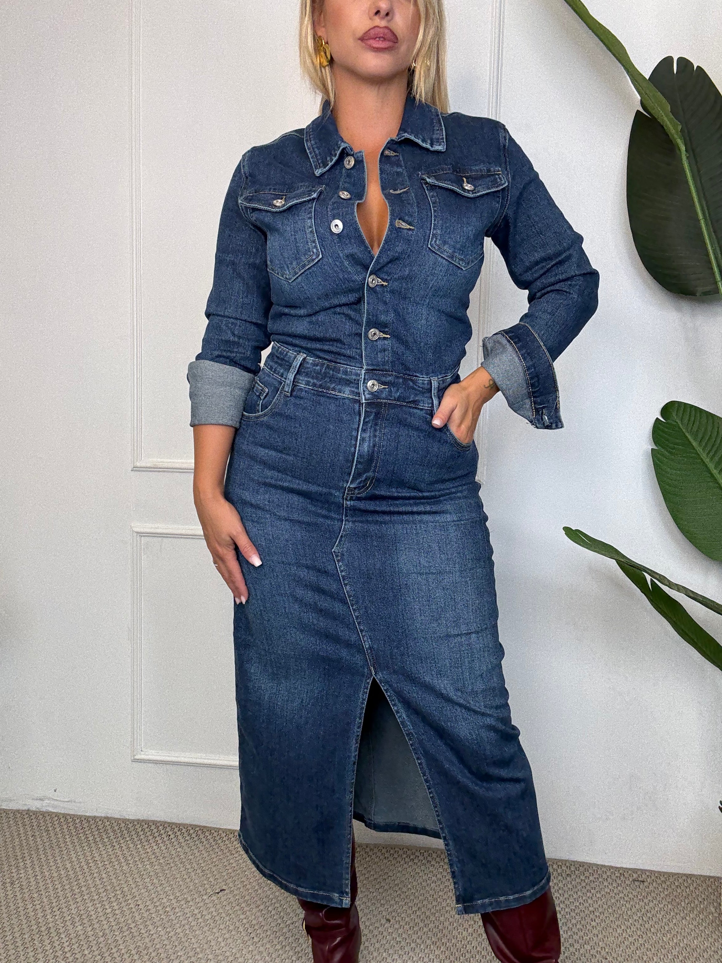 Abito di jeans, manica lunga, con spacco .