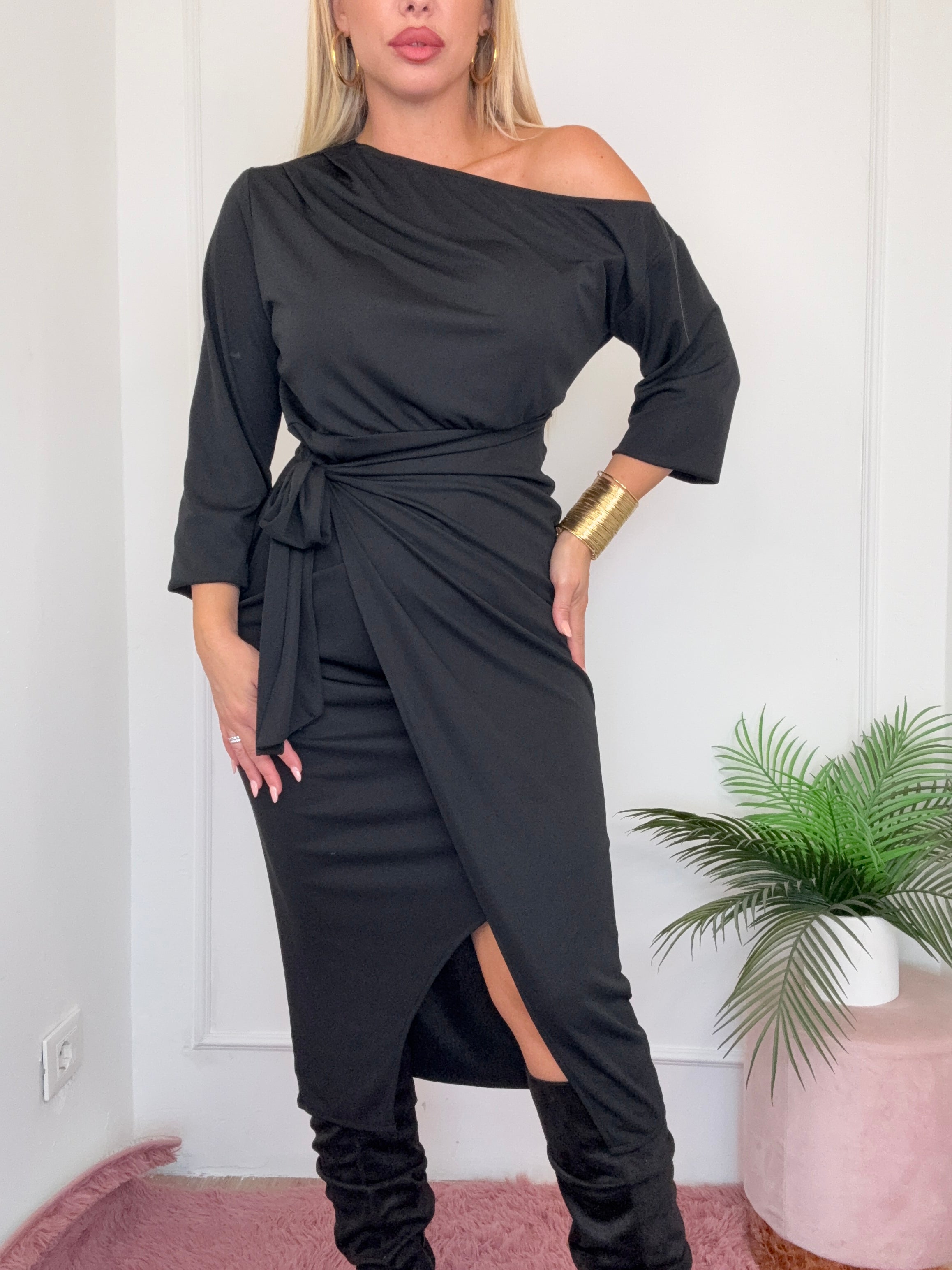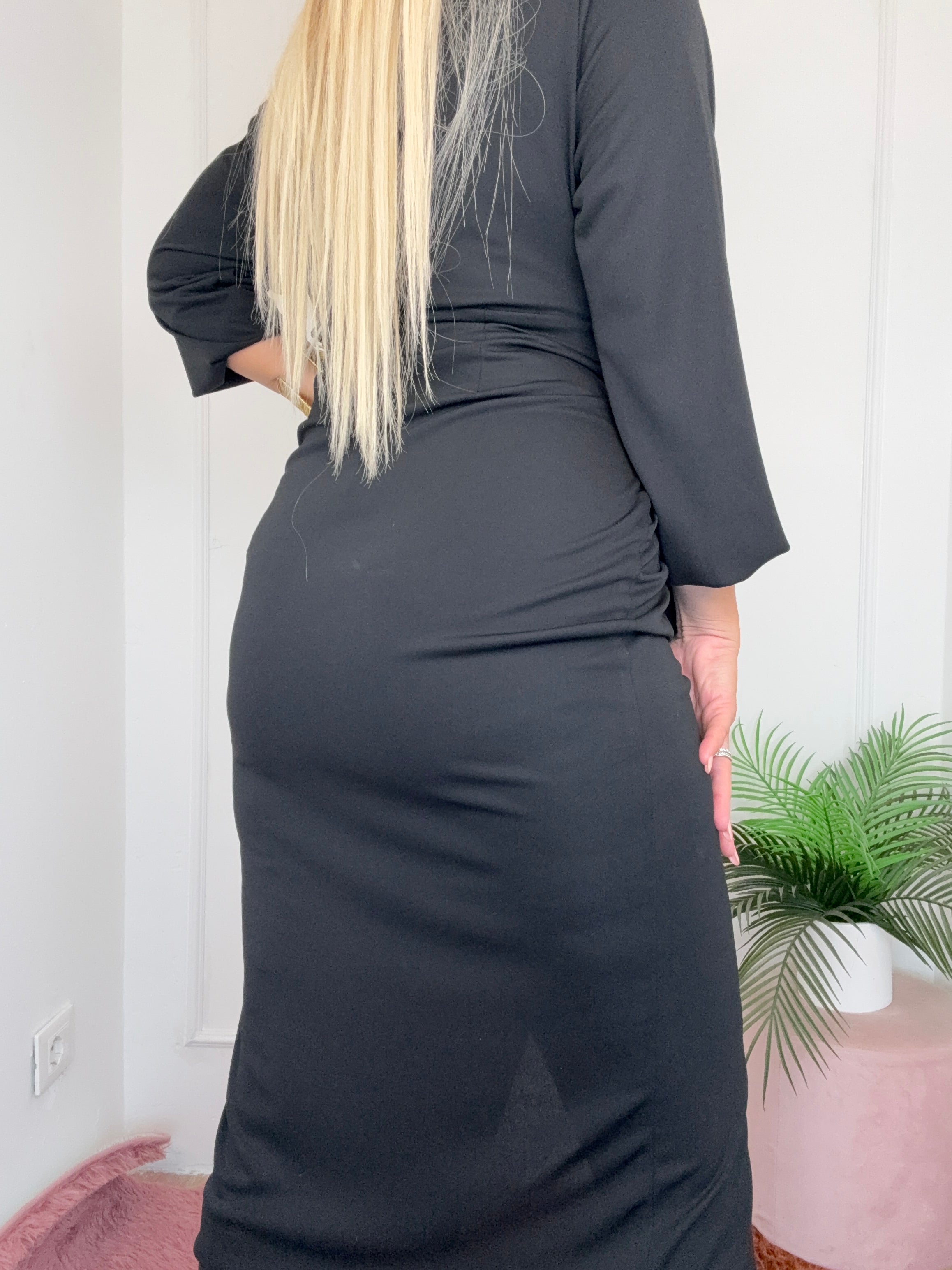 Abito nero midi con pence frontale drappeggiato elastico in vita manica sbuffo vestibilita’ molto elasticizzata