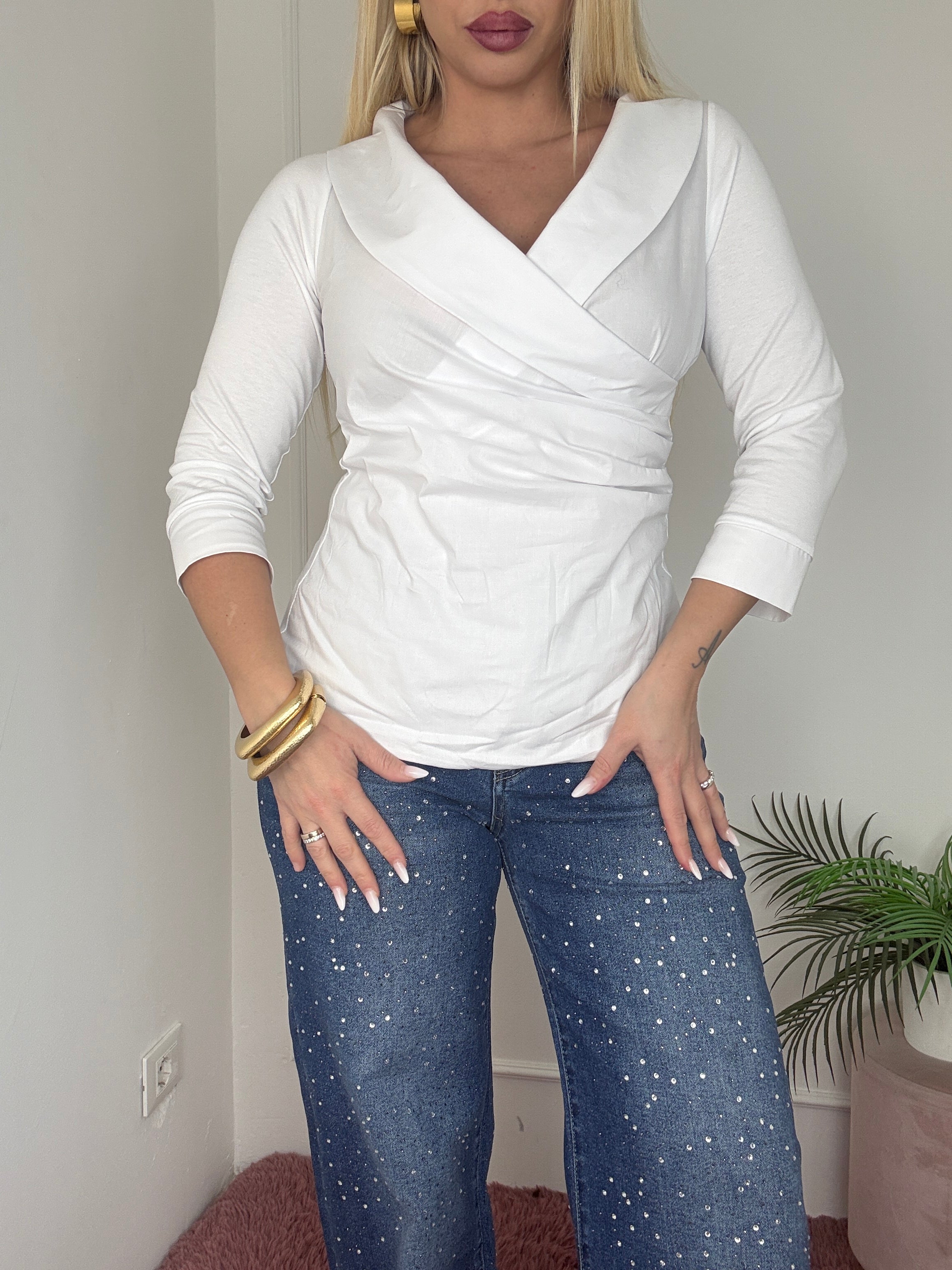 camicia manica 3/4 con collo sciallato e pence