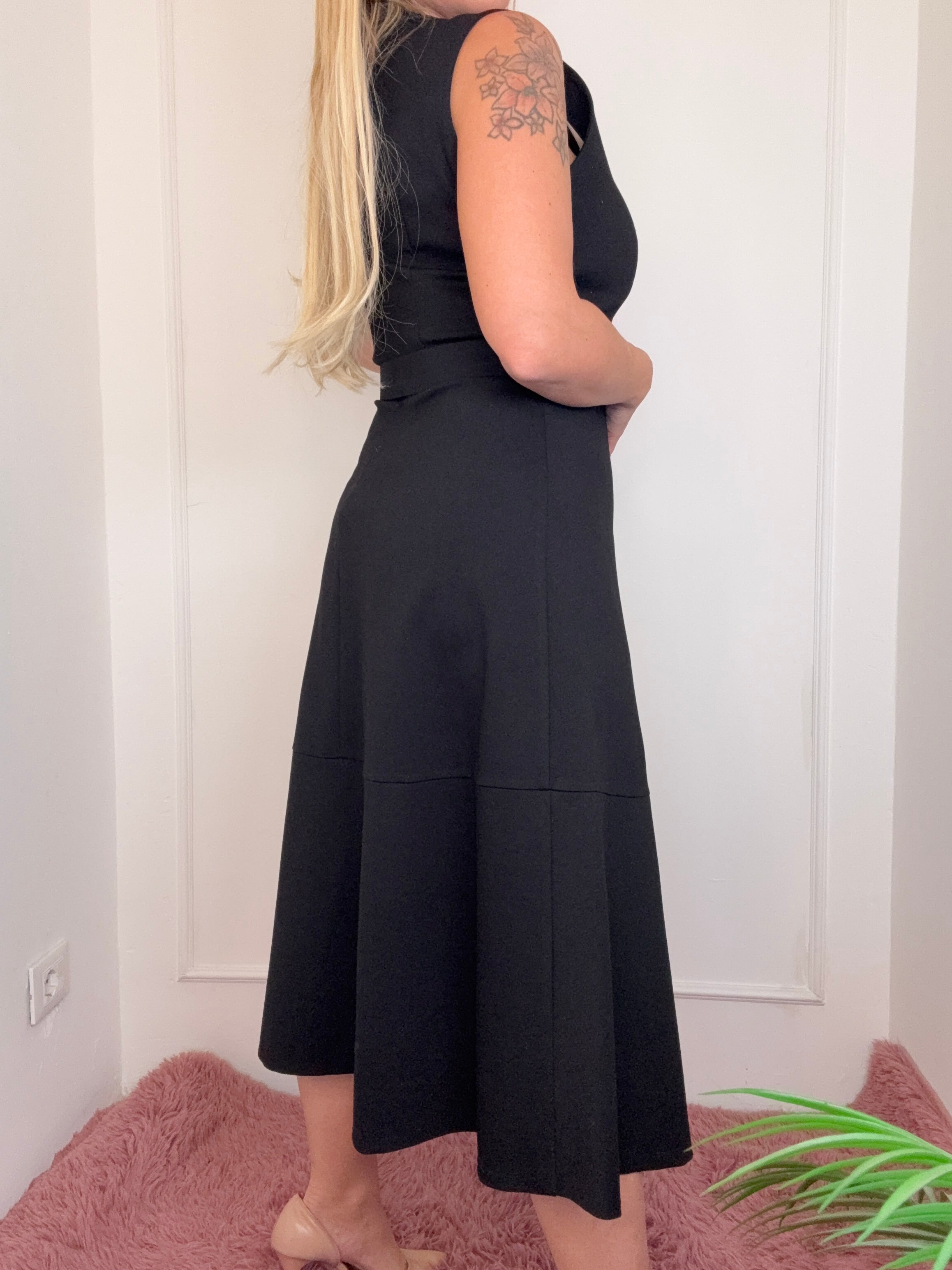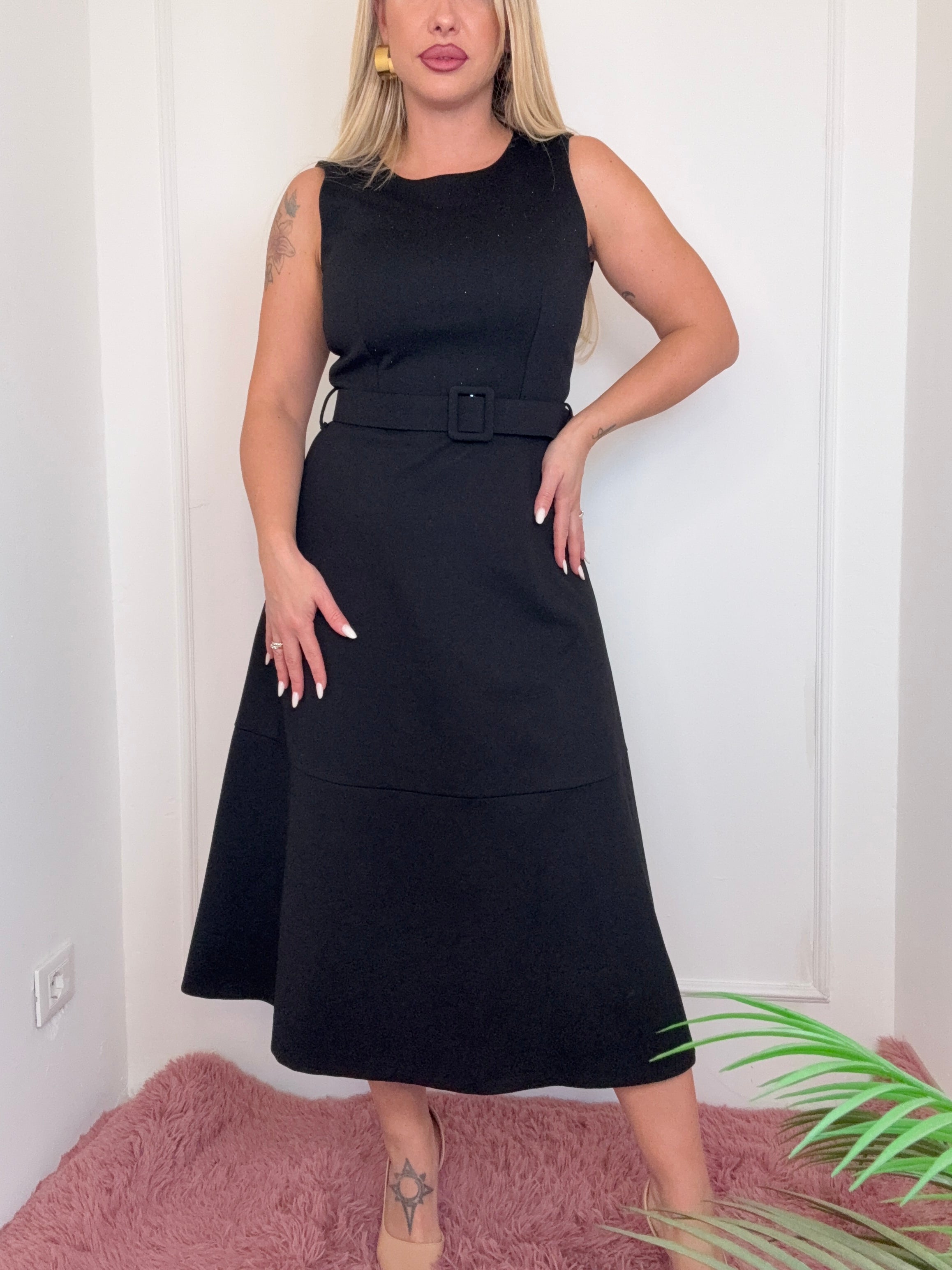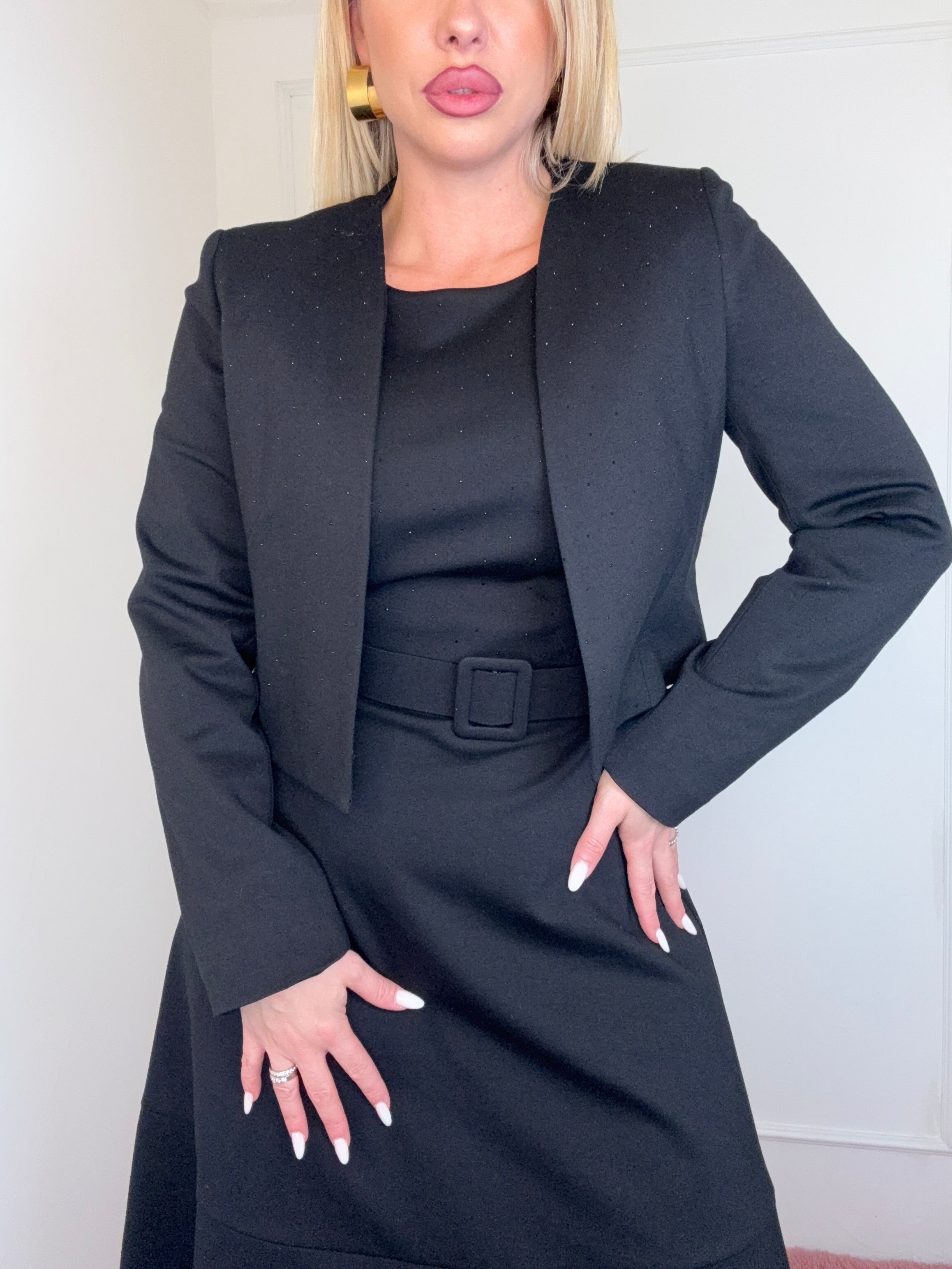 completo composto da abito a campana con cintura in vita e bolerino micro glietter