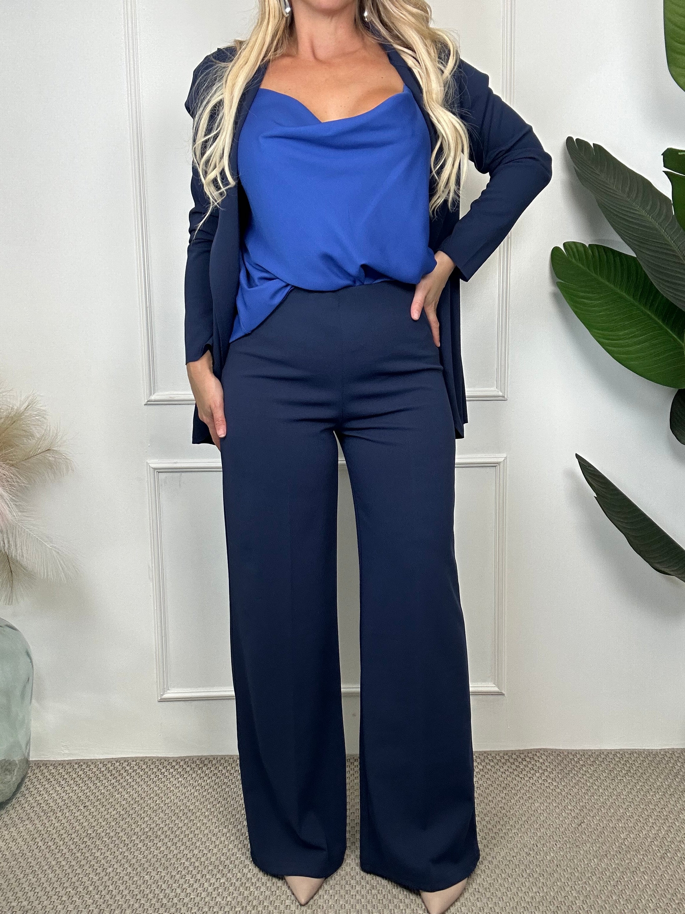 Completo blu navy composto giacca con vestibilità fluida senza tasca, senza spalline e senza bottoni, pantalone a palazzo con elastico in vita
