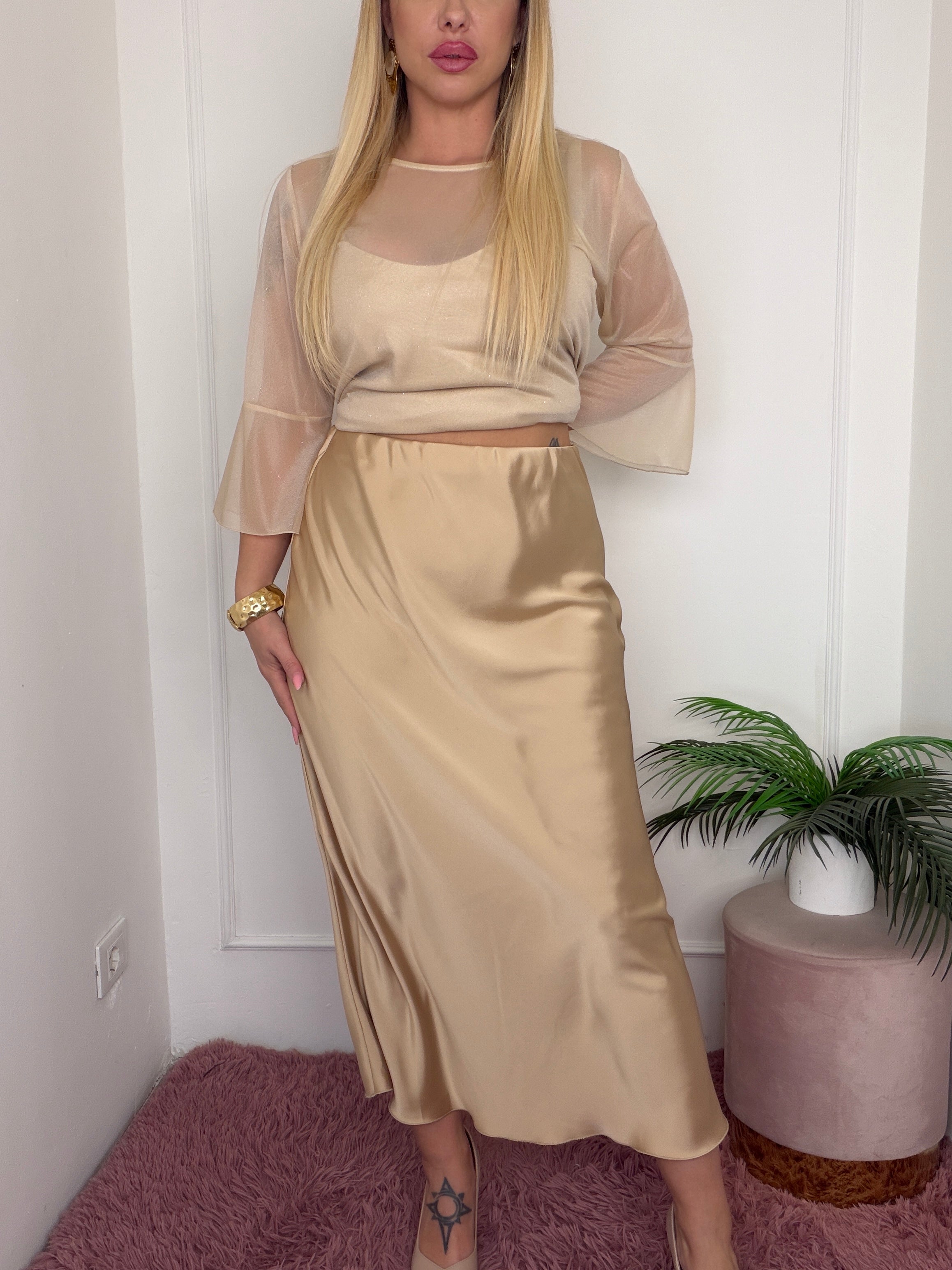 completo fluido effeto seta, composto da gonna con maglia effetto vedo non vedo e canotta