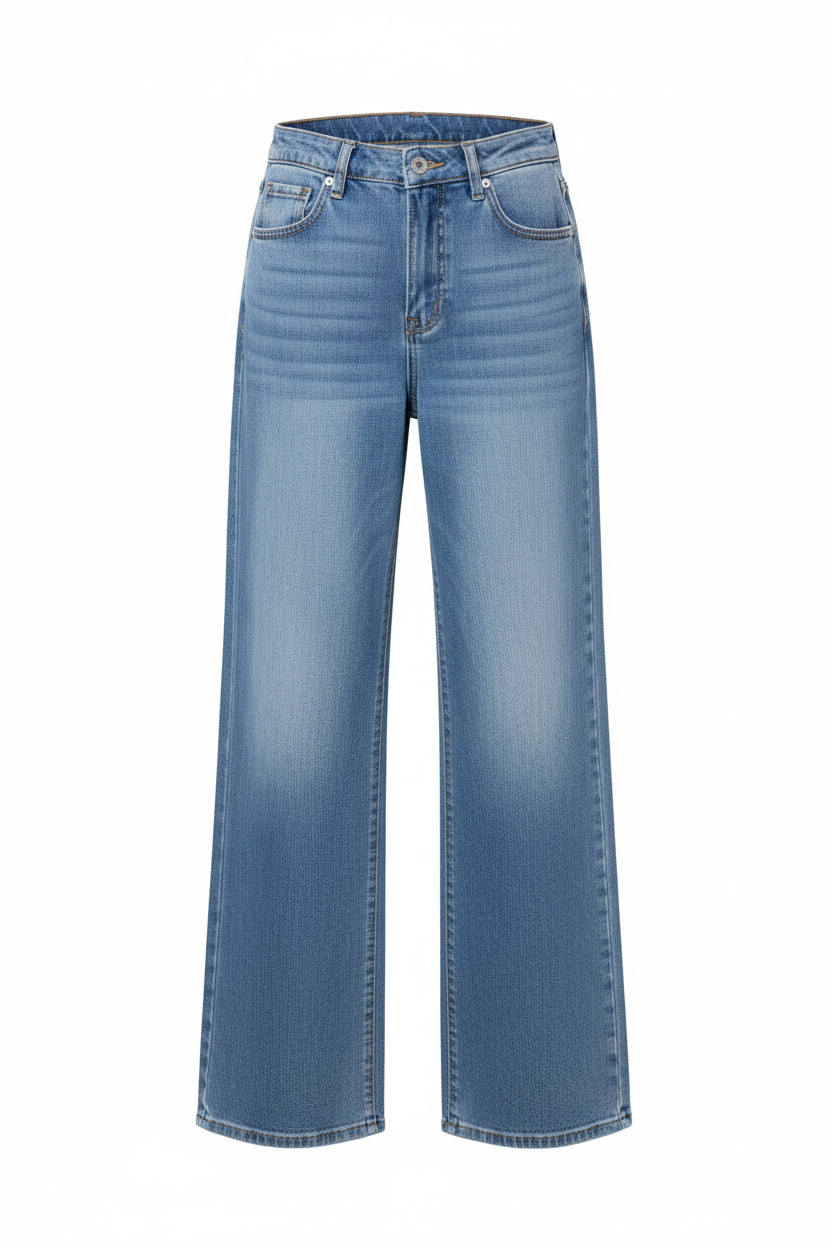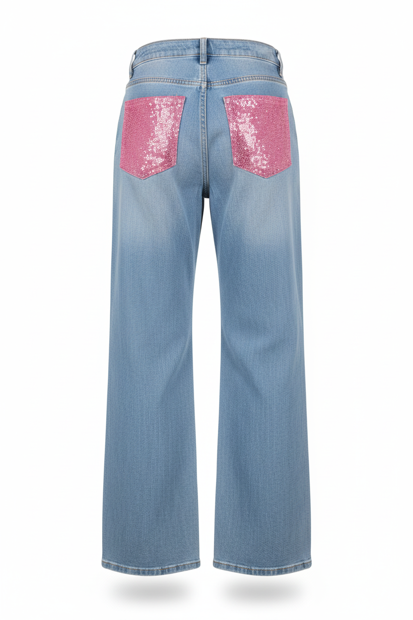 Jeans wide leg con tasca rosa brillantinata