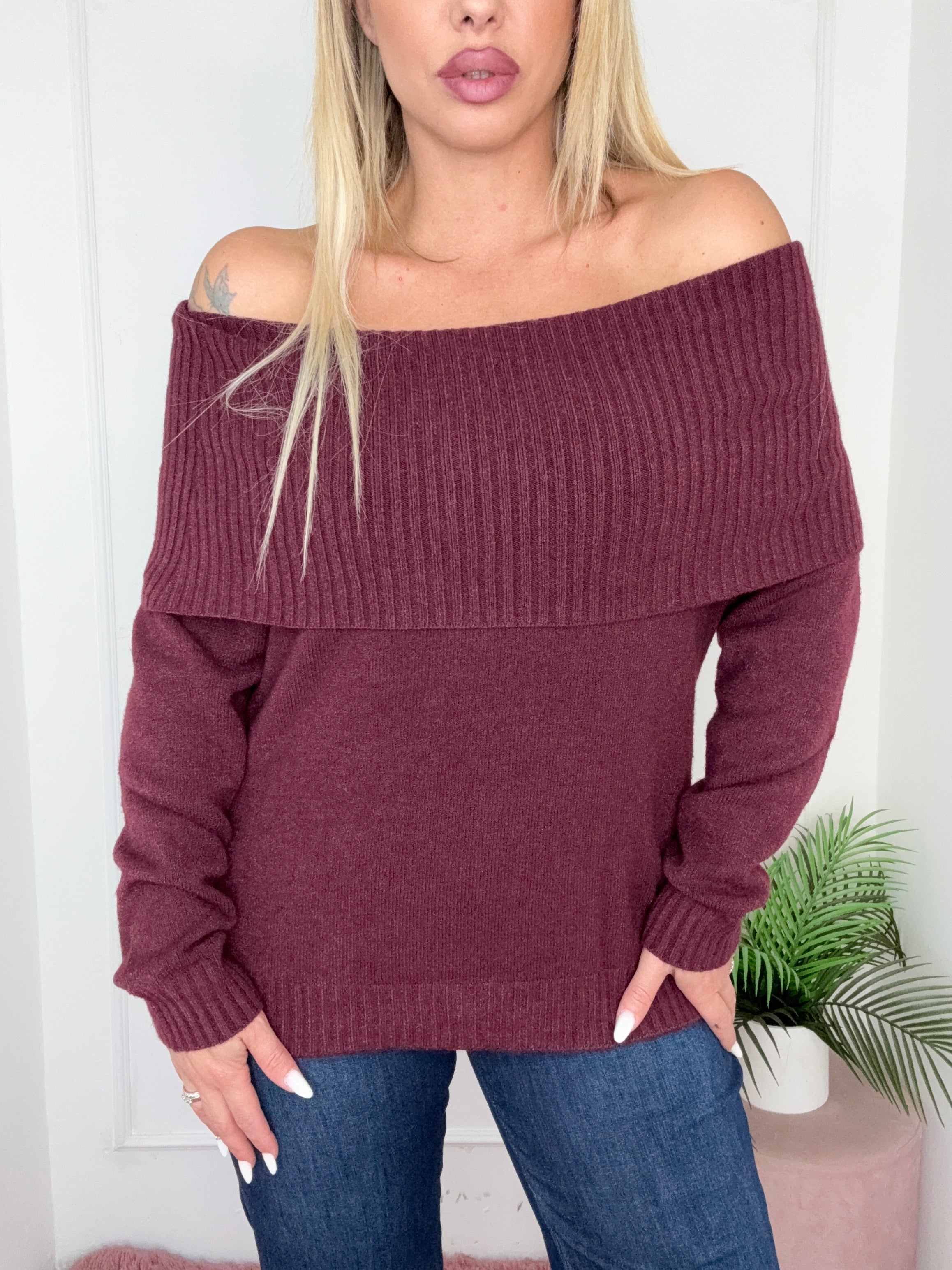 Maglia color bordeaux, con scollo a barca