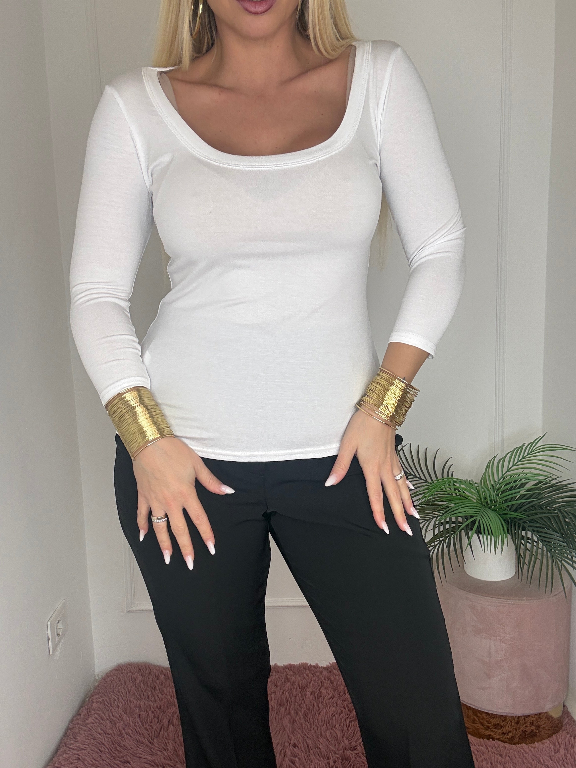 Maglia bianca, scollo ampio da utilizzare sia a barca che rotondo