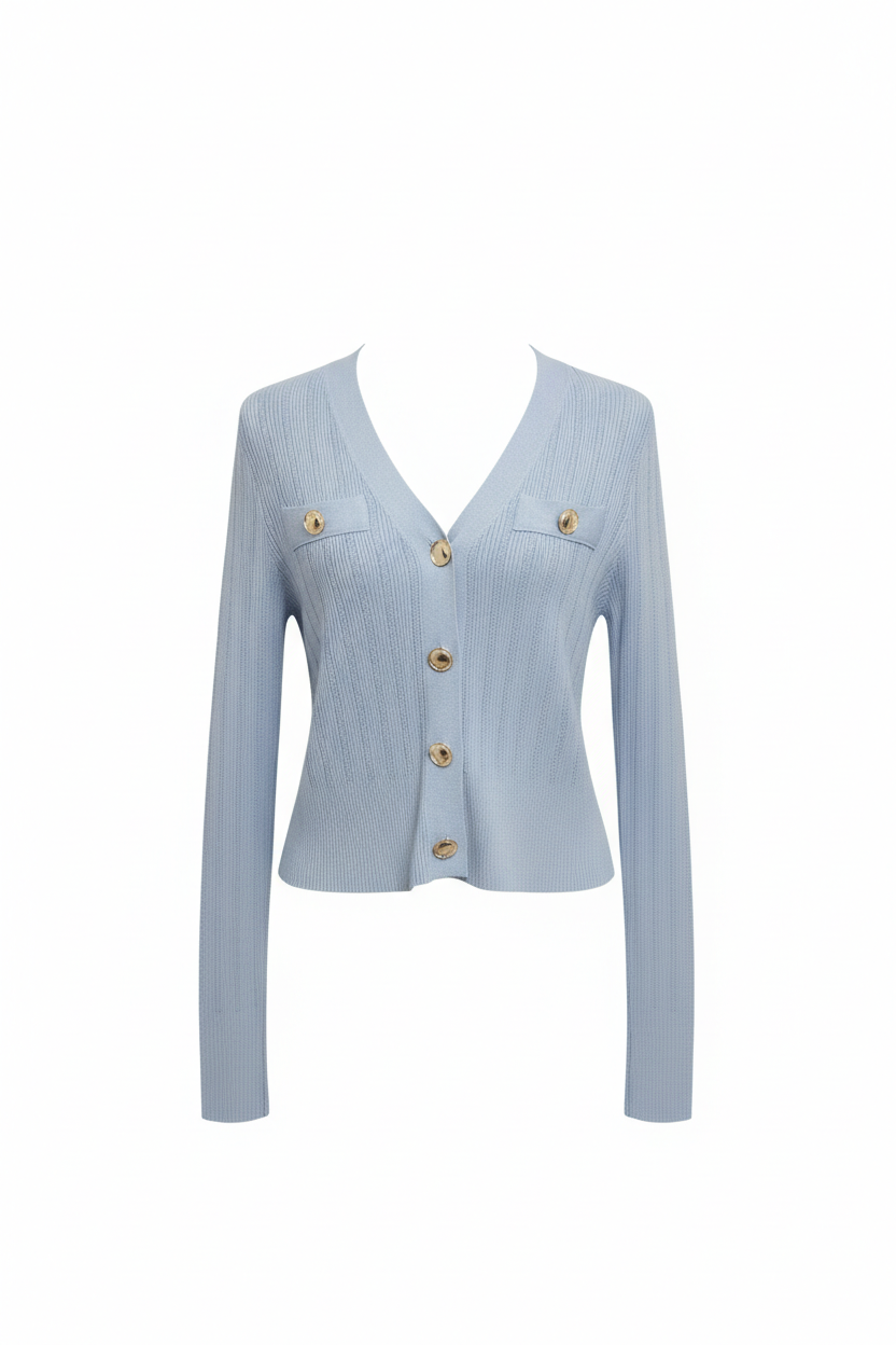 Maglioncino azzurro manica lunga in cotone con bottoni oro e taschine estetiche