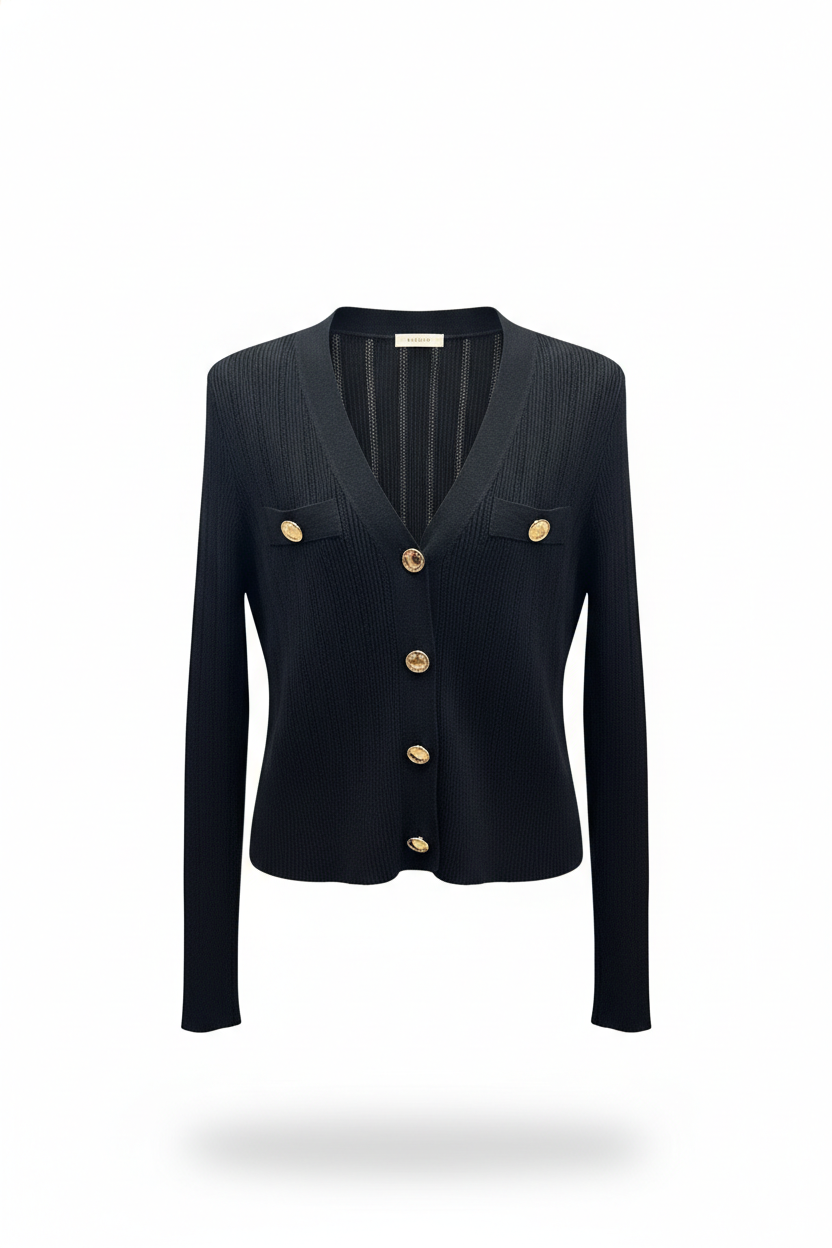 Maglioncino nero manica lunga in cotone con bottoni oro e taschine estetiche