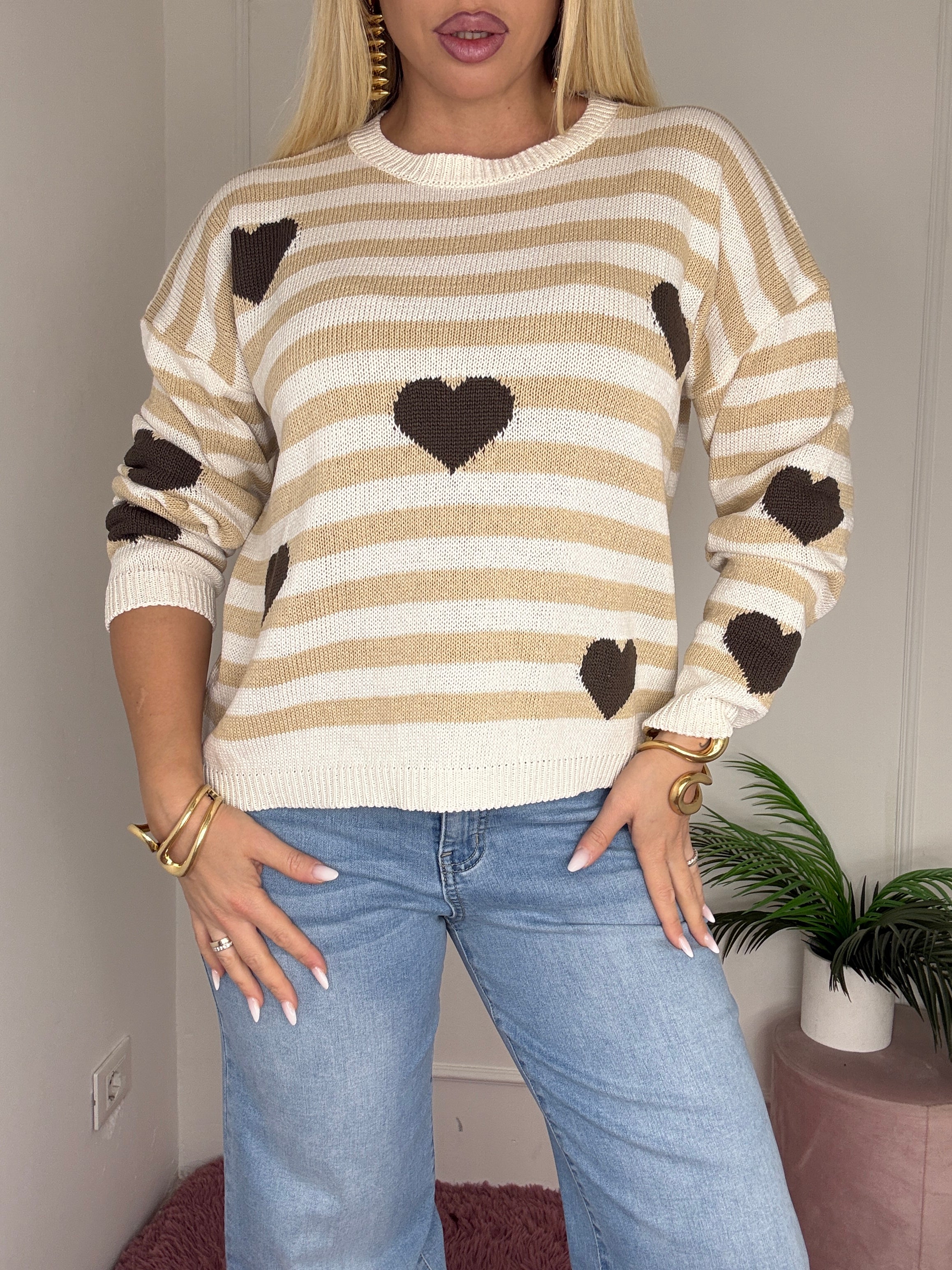Maglia burro con righe sabbia e dettaglio cuori marrone