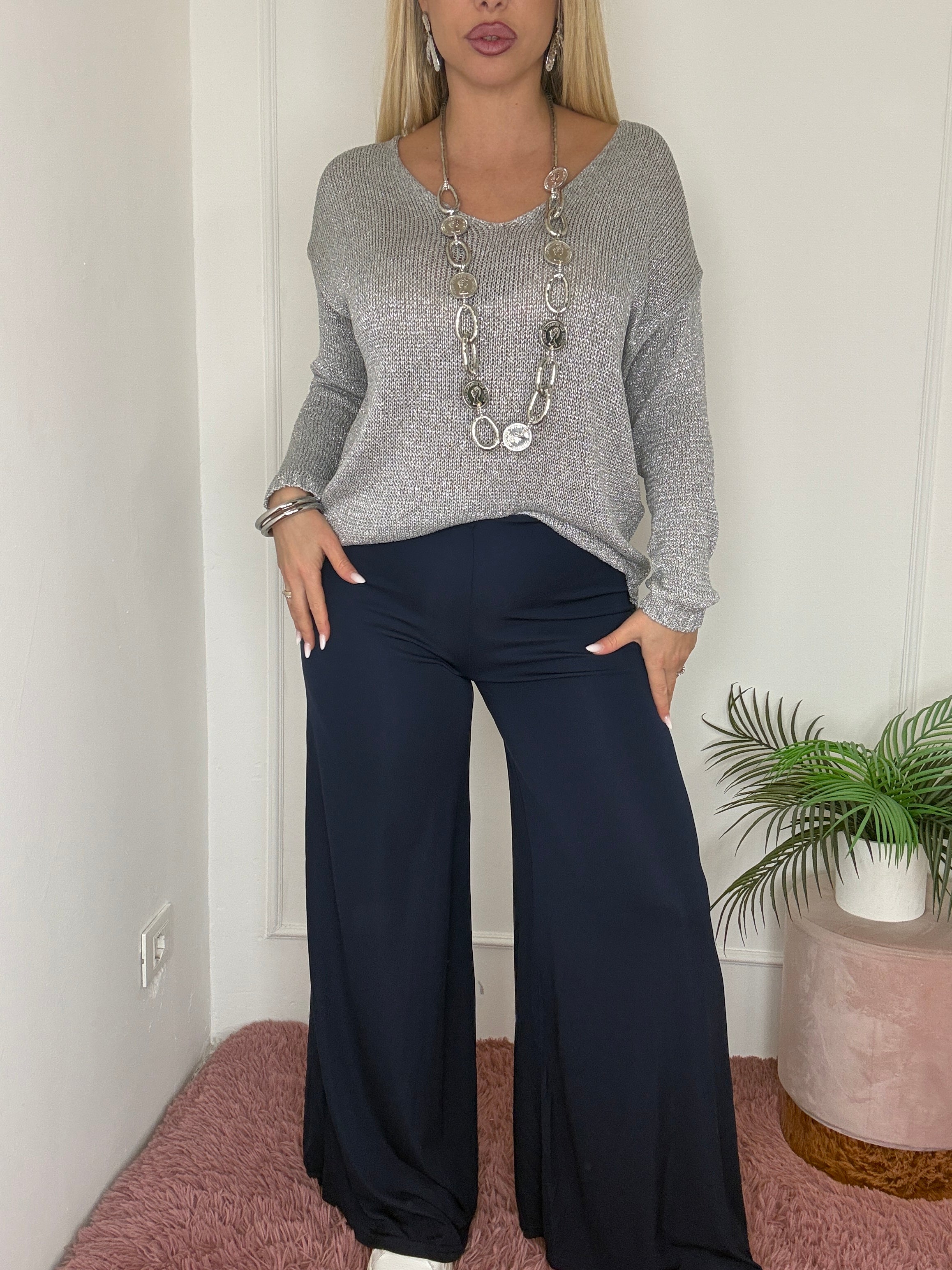 pantalone blu fluido a palazzo.