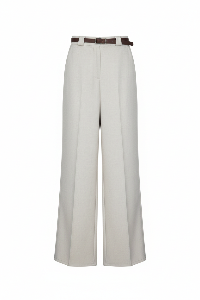 pantalone dritto con cerniera e bottone, tasche laterali e cintura.
