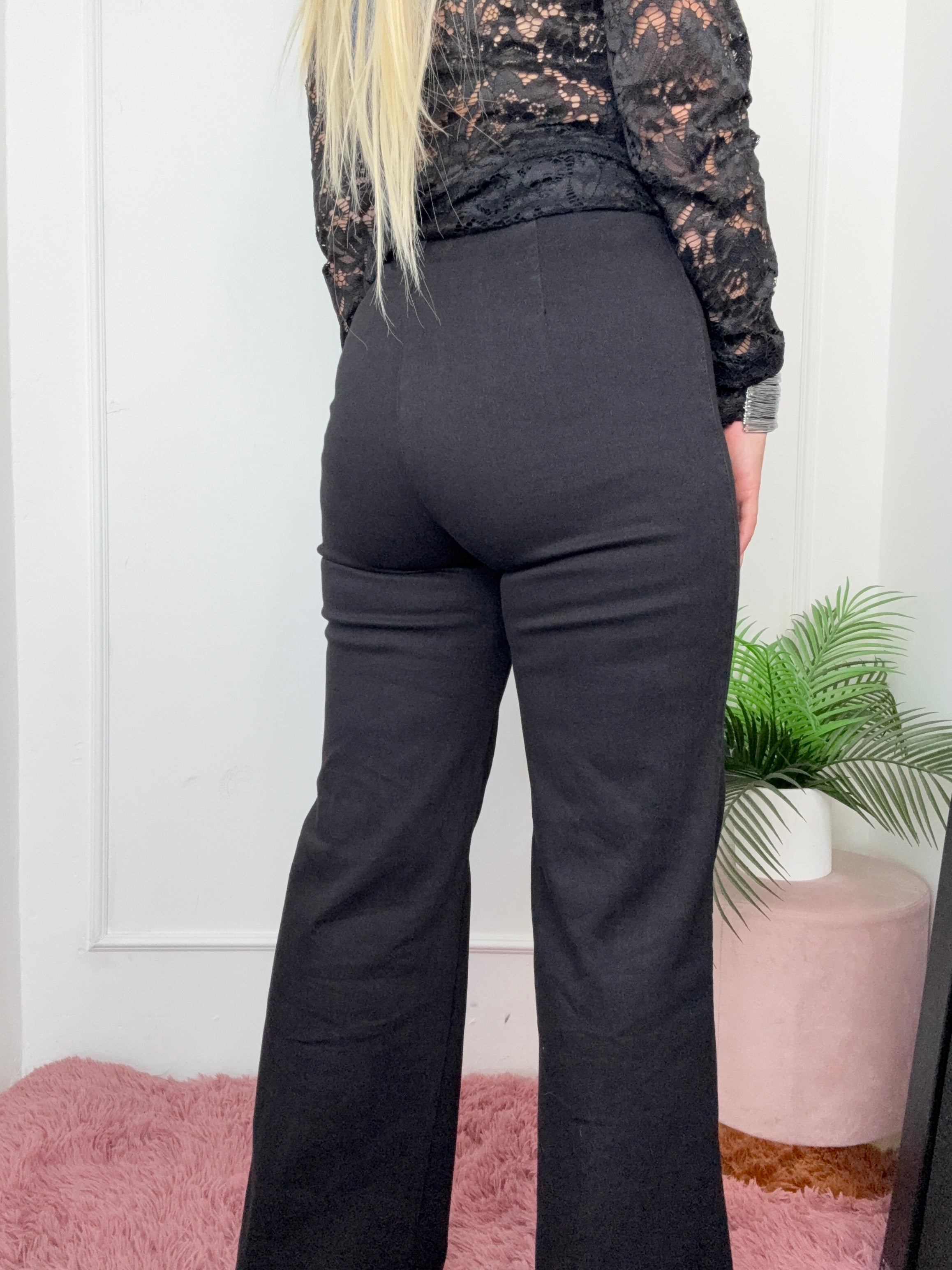 pantalone con bottone, con elastico in vita, a zampa