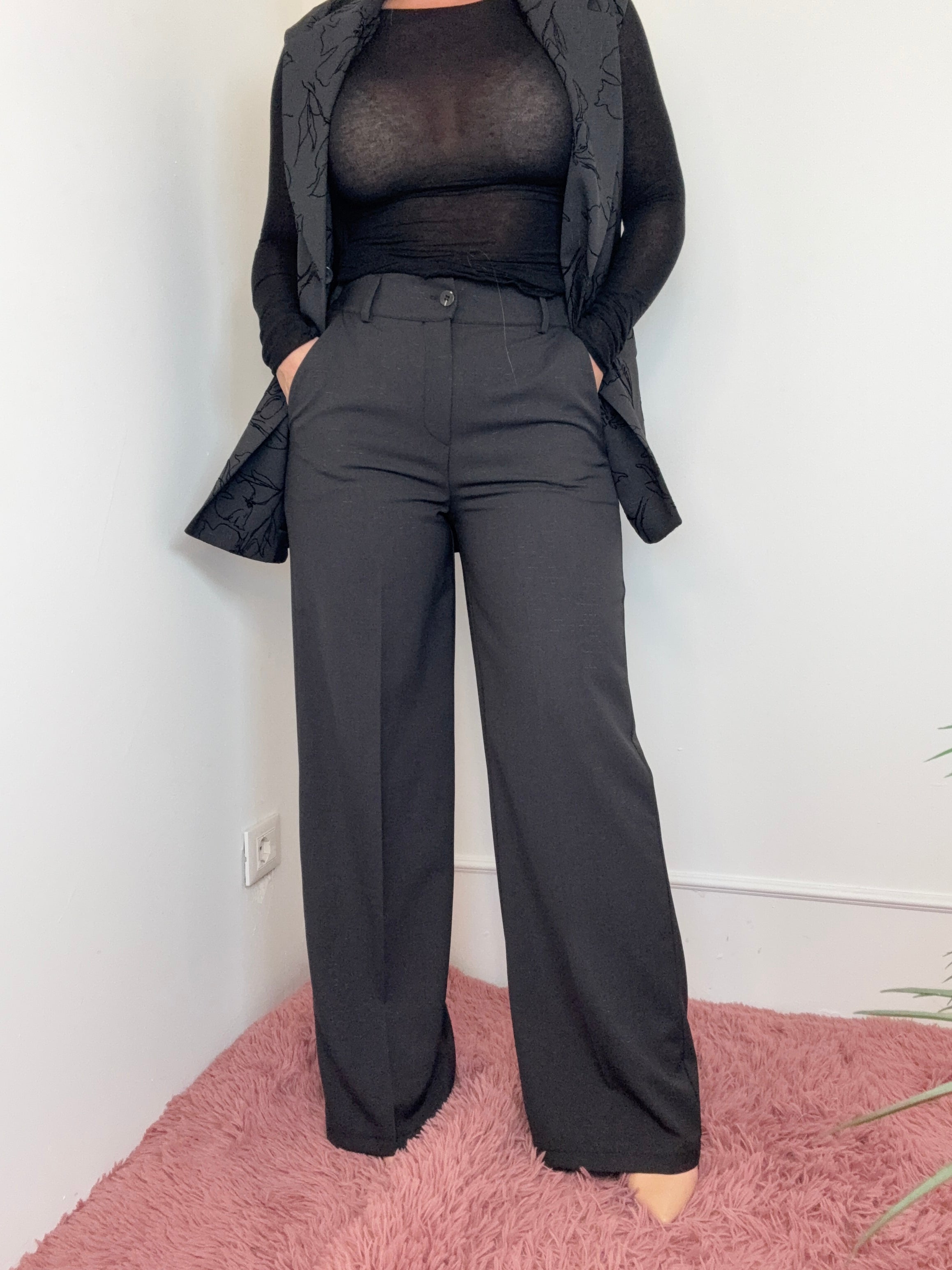 pantalone grigio a palazzo, con zip e bottone e elastico posteriore
