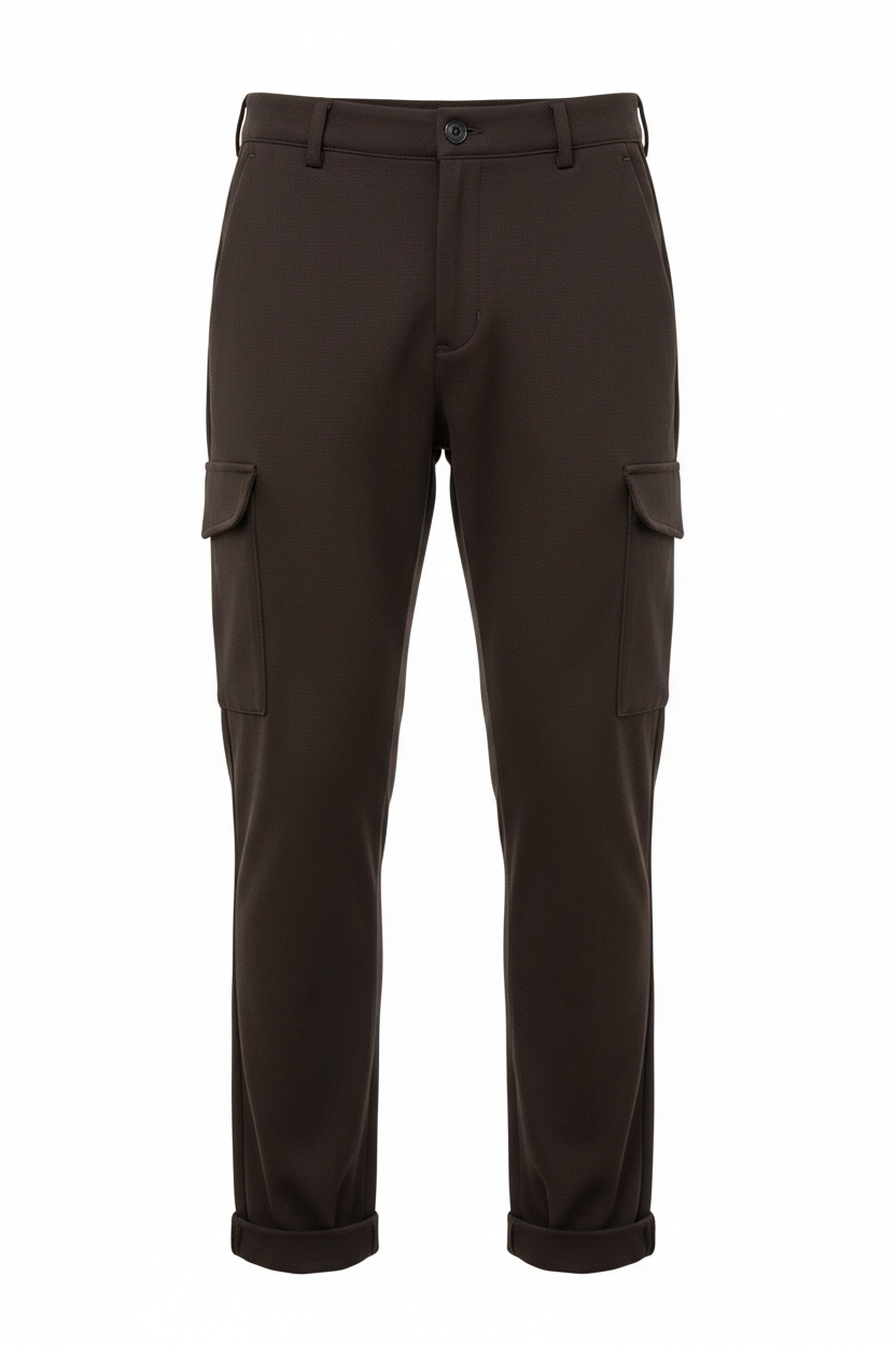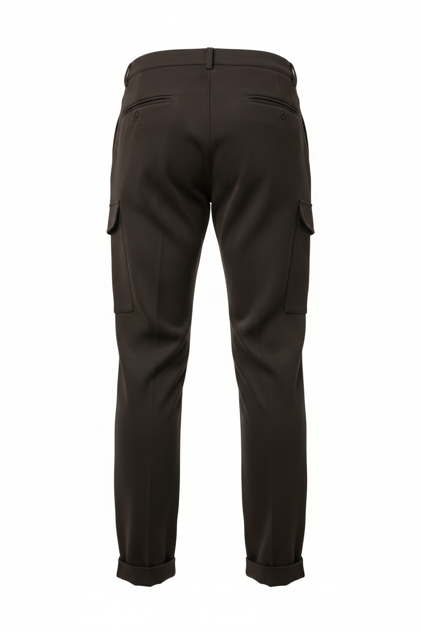 Cargo elasticizzato con risvoltino, tasche laterali, bottone centrale e cerniera. Finte tasche posteriori